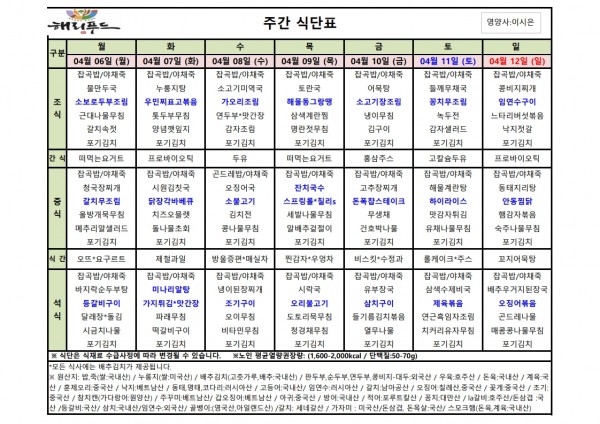 4월 첫째주 식단표 페이지 정보 작성자 은천노인복지회 작성일26-04-03 17:58 조회14회 댓글0건 관련링크 다음글 목록 답변 본문 4월 첫째주 어르신 식단표 안내해 드립니다. 정성과 영양을 담아 준비하겠습니다. 다음글 목록 답변