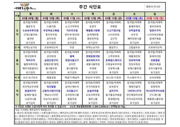 3월 둘째주 식단표 페이지 정보 작성자 은천노인복지회 작성일26-03-06 15:04 조회2,055회 댓글0건 관련링크 이전글 다음글 목록 답변 본문 3월 둘째주 어르신 식단표 안내해 드립니다. 정성과 영양을 담아 준비하겠습니다. 이전글 다음글 목록 답변